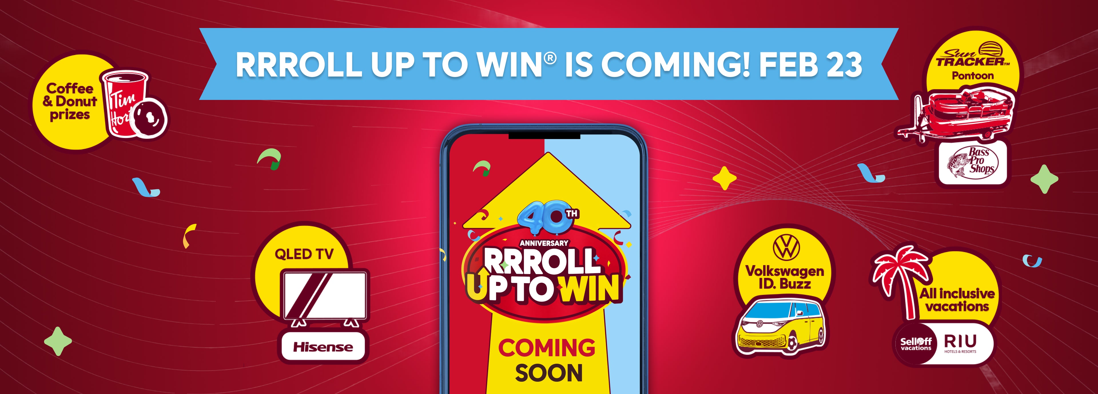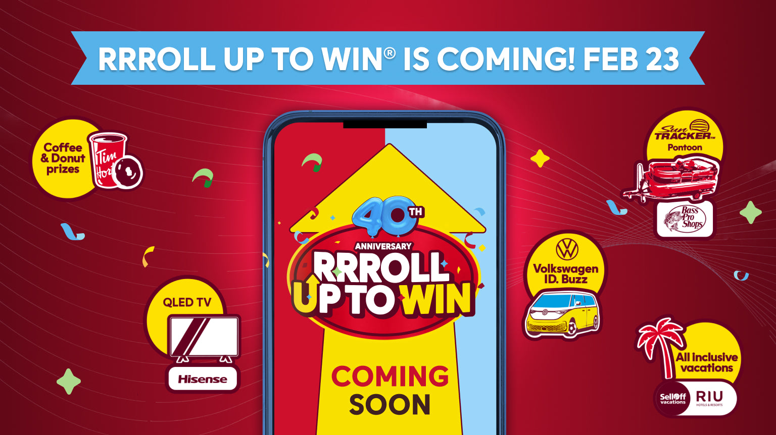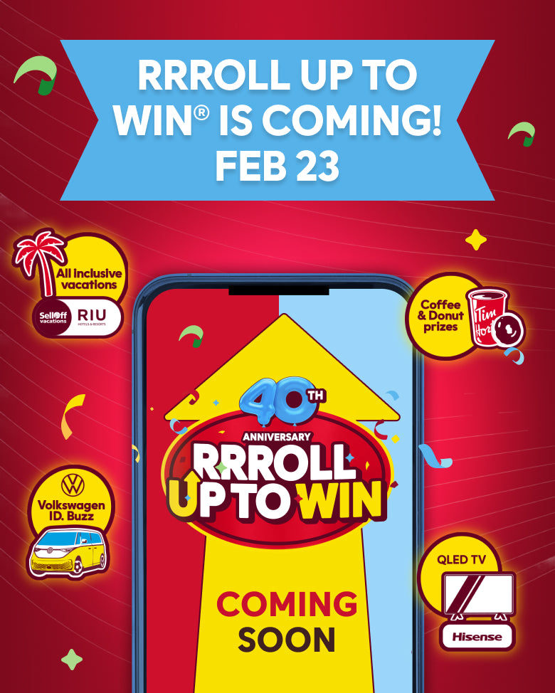 NO PURCHASE NECESSARY. No purchase mail-in methods of entry also available. Only open to age of majority (or age 13+ (14+ in Quebec), with parent/guardian consent) residents of Canada. Void where prohibited. Contest starts at 12:00:00 a.m. ET on February 23, 2026 and ends on March 22, 2026 at 11:59:59 p.m. ET (consists of a paper cup roll period and digital roll period). Paper cup roll period will end once paper cups are depleted. Paper cup rolls available only while cup supplies last and will vary per restaurant (check in-restaurant before ordering). During the contest period receive: (i) either (a) 2 base digital rolls (and 2 bonus digital rolls, if eligible) per eligible reusable cup purchase, or (b) 1 base digital roll (and 1 bonus digital roll, if eligible) and, only while cup supplies last, 1 paper cup roll per eligible paper cup purchase, for an eligible hot beverage from a participating Tim Hortons restaurant; (ii) 1 base digital roll (and 1 bonus digital roll, if eligible) per eligible menu item purchase (excluding eligible hot beverages) from a participating Tim Hortons restaurant; (iii) 3 base digital rolls (and 3 bonus digital rolls, if eligible) per eligible Tims® at Home product purchase or eligible Tim Hortons merchandise product purchase from a participating Tim Hortons restaurant; (iv) 3 base digital rolls per eligible Tims® at Home product purchase from a participating third-party retailer; and/or (v) 3 base digital rolls per eligible Tims® at Home product purchase or eligible Tim Hortons merchandise product purchase from TimShop.ca. IMPORTANT NOTE – bonus digital rolls (‘2 x Digital Rolls’): To receive the bonus digital rolls set out in (i)-(iii) above, eligible purchases must be completed via the Tim Hortons app or Timhortons.ca website using the mobile order and pickup function or Tims Delivery. IMPORTANT NOTE - third-party retailer and TimShop.ca purchases: In order to receive digital rolls for eligible third-party retailer product purchases and eligible TimShop.ca product purchases, you must complete an eligible submission of your receipt, or proof of delivery or pickup (as applicable), to timsathomepromotion.ca and a free account registration by March 30, 2026 at 11:59:59 p.m. ET; limit of 90 digital rolls total per person, per valid phone number for eligible third-party retailer product purchases and for eligible TimShop.ca product purchases. Receipt of a digital roll in connection with an eligible purchase from a participating Tim Hortons restaurant requires use of a physical or digital Tims Rewards card. In order to reveal a digital roll, you must have registered for a Tims Rewards account. All digital rolls must be revealed on or before April 3/26 at 11:59:59 p.m. ET. All coffee and donut prizes must be redeemed by April 7/26. All other prizes must be claimed by May 4/26. Cup prizes available at contest start: (i) 10 x Endy Dream Bedroom prizes, approx. odds at outset 1 in 8,852,920, ARV $6,495 CAD each; (ii) 4 x 2025 Volkswagen ID.Buzz Vehicle prizes, approx. odds at outset 1 in 22,132,299, ARV $87,628 CAD each; (iii) 50 x Hisense 98" QLED TV prizes, approx. odds at outset 1 in 1,770,584, ARV $2,000 CAD each; (iv) 2 x 2026 Sun Tracker Party Barge and Trailer prize, approx. odds at outset 1 in 44,264,599, ARV $34,500 CAD; (v) 20 x SellOffVacations 7-Night All-Inclusive Trips for 2 with RIU prizes, approx. odds at outset 1 in 4,426,460, ARV $6,500 CAD each (based on a hypothetical Toronto departure and Punta Cana destination point example); and (vi) 14,716,495 x Coffee and Donut prizes, approx. odds at outset 1 in 6, ARV $1.56 - $8.39 CAD each (9,883,202 x Coffee prizes, approx. odds at outset 1 in 9, ARV $1.59 - $8.39 CAD each; 4,833,293 x Donut prizes, approx. odds at outset 1 in 18, ARV $1.56 - $2.59 CAD each). At contest start, number of cups vary by region. Cup prizes available will decrease as cups are distributed and cup prizes are claimed. Digital prizes available at contest start: (i) 50 x Tim Hortons® x Skullcandy Crusher® ANC 2 Headphones prizes, ARV $299.99 CAD each; (ii) 500,000 x 40% off (MSRP) Skullcandy.ca Discount Code prizes (ARV depends on value of eligible items purchased); (iii) 200,000 x Endy.com $50 CAD Gift Code prizes; (iv) 100 x Endy Mattress of your choice prizes, ARV $495 - $1,895 CAD each; (v) 3 x 2025 Volkswagen ID.Buzz Vehicle prizes, ARV $87,628 CAD each; (vi) 200 x 55” Hisense TV prizes, ARV $600 CAD each; (vii) 250 x Kobo Libra Colour eReader Bundle prizes, ARV $514.94 CAD each; (viii) 1,500 x $50 CAD Bass Pro Shops Digital E-Gift Card prizes; (ix) 1 x 2026 Sun Tracker Party Barge and Trailer prize, ARV $34,500 CAD; (x) 3 x 2025 Tracker Off Road 600, ARV $ 9,778 CAD each; (xi) 20 x $1,000 CAD Rakuten Cash Back prizes; (xii) 12,000 x $25 CAD Rakuten Cash Back prizes; (xiii) 30,000 x $10 CAD Rakuten Cash Back prizes; (xiv) 20 x SellOffVacations 7-Night All-Inclusive Trips for 2 with RIU prizes, ARV $6,500 CAD each (based on a hypothetical Toronto departure and Punta Cana destination point example); (xv) 40 x Journie $250 CAD Gift Card prizes; (xvi) 500,000 x Journie Road Trip Bundle Digital Code prizes, ARV $10 CAD each; (xvii) 25,000 x $20 CAD Uber Eats Digital Gift Card prizes; (xviii) 17,000 x $15 CAD Pet Valu® or Chico® (residents of QC only) Gift Card prizes; (xix) 15 x A Year of Free Dry Dog or Cat Food prizes, ARV $2,040 CAD each; (xx) 25,050 x Free Too Good To Go Surprise Bag prizes, ARV $4.99 CAD each; (xxi) 80,000 x Simons $10 CAD Virtual Gift Card prizes; (xxii) 30 x VIP Experience prizes, each at contest start consisting of the winner’s choice of 1 of the following experience prize options, subject to availability (VIP experience prize options available will decrease as prize options are claimed): (a) 5 x Simons VIP Shopping Spree prizes at contest outset, ARV $7,500 CAD each; (b) 6 x Cirque du Soleil 2-night VIP Premiere Big Top getaway Package prizes at contest outset, ARV $4,000 CAD each (based on 